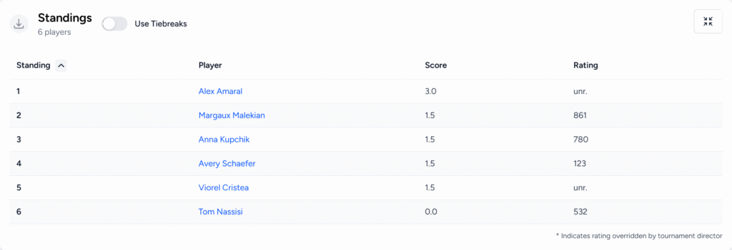 Adding to the drama was the fact that we ended with a 4 way tie for second place! Thanks to 2 draws in the first round and a few upsets here and there Anna, Margaux, Viorel, and Avery all tied with 1.5 pts and split the $60 prize!