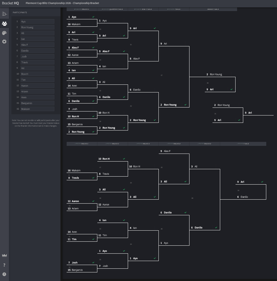 The first game of the grand finals ended in a draw! Ari was still alive, but still needed 2 games. They switches colors and played again but this time Ari won! The winner of the next game would be the 2nd Piermont Blitz Champion.