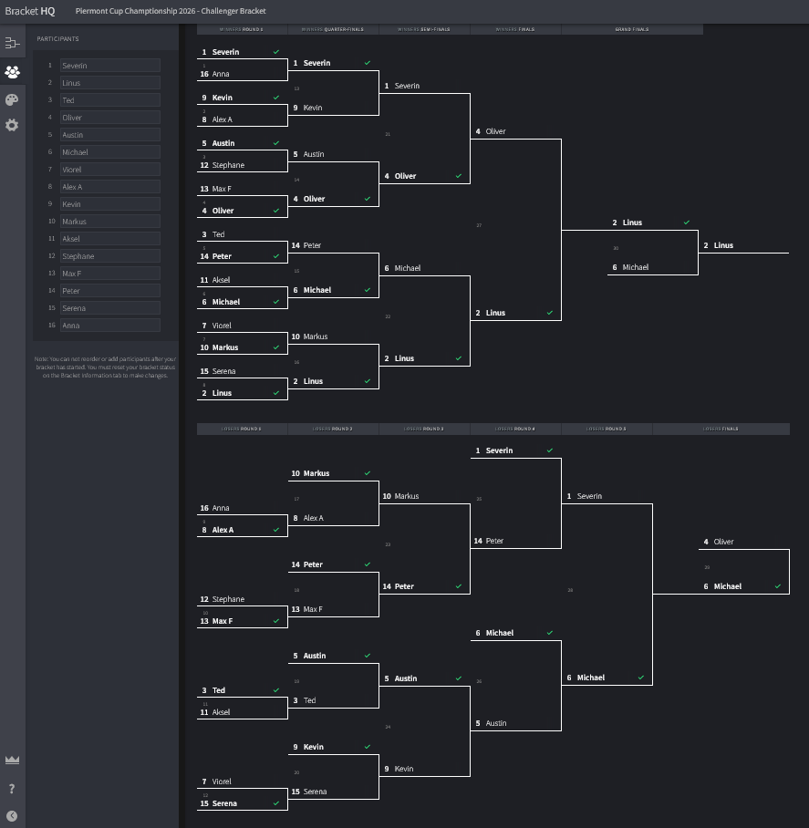 The final four in the Challengers bracket were: Oliver Blatt (1156), Michael Maratea (1200 P), Linus Chang (1536), and Severin Demonterey (1222).